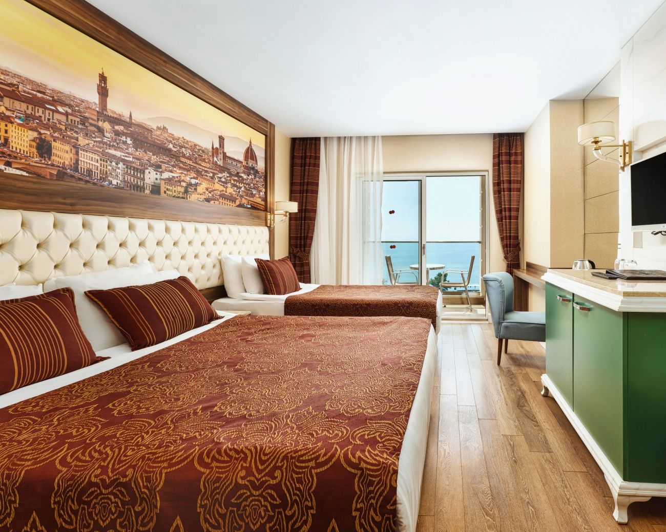 Хотелът разполага с 259 стаи. Всяка стая е оборудвана с климатик, сателитна телевизия, телефон, баня с душ, сешоар, мини бар(безплатен, 3 на седмица се пълни), сет за кафе и чай, сейф, балкон.