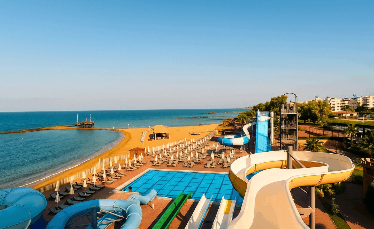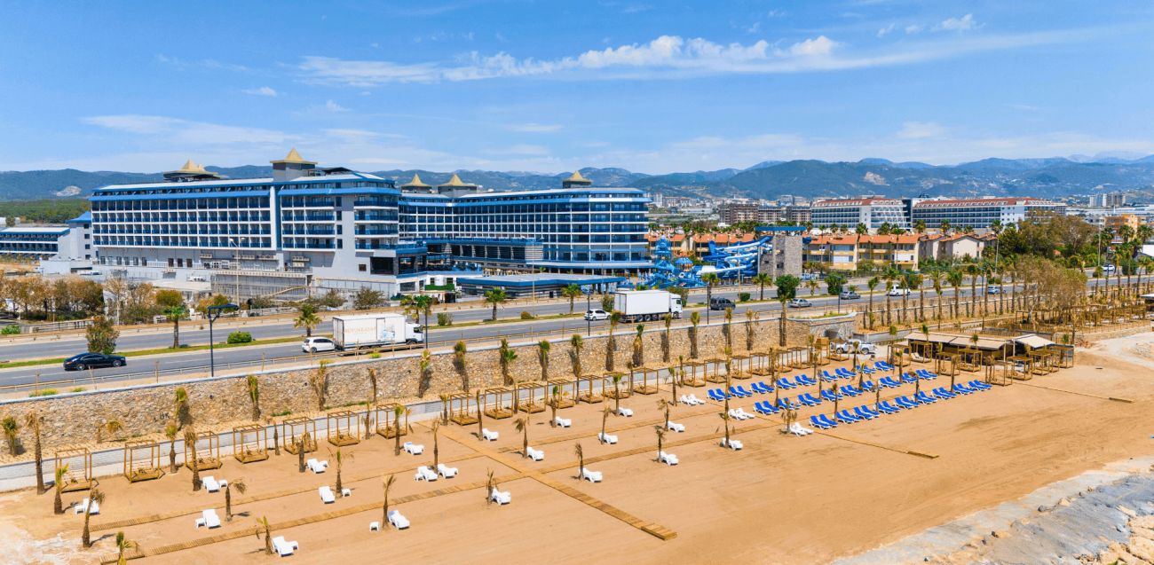 Намира се на 100 км от летище Анталия, на 110 км от центъра на Анталия, на 18 км от центъра на Алания, на 250 м от брега на морето, чрез подлез. Построен 2024 г., на обща площ от 43 000 м2. Достъп до Еftalia Island, разположен на плажа, състоящ се от аквапарк с басейни, водни пързалки и заведения.